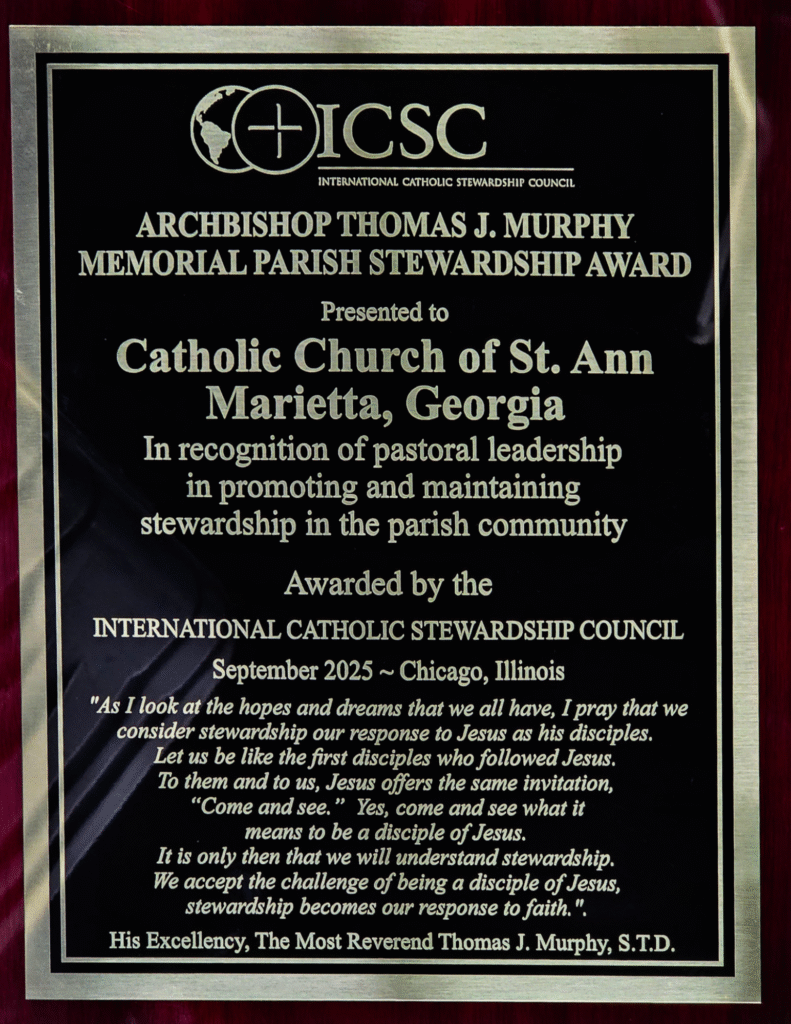 Marietta, Georgia – September 21, 2025 – The Catholic Church of St. Ann has been named the 2025 recipient of the Archbishop Thomas Murphy Parish Stewardship Award, presented by the International Catholic Stewardship Council (ICSC). This national annual award recognizes a parish that exemplifies outstanding commitment to Christian stewardship and discipleship.